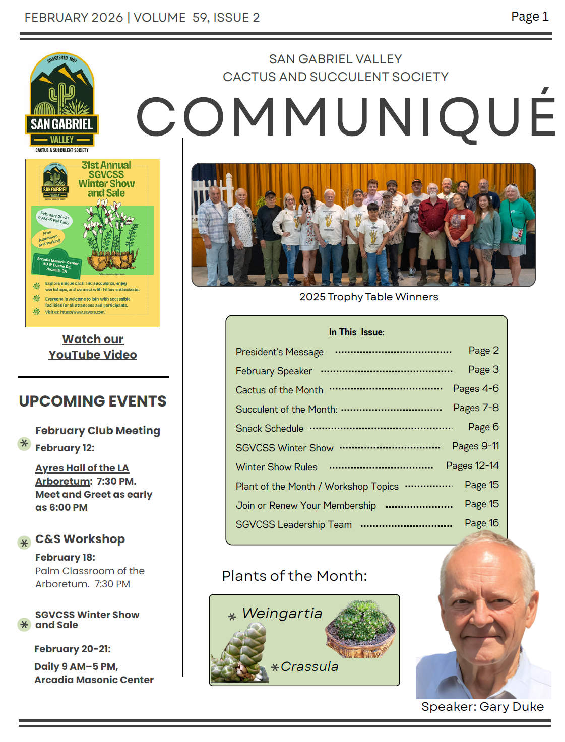 Gary Duke has collected cacti and succulents since age 10. A retired Air Force officer with a PhD in physics, he moved his ever-growing collection across the country during his military career and helped found a cactus and succulent society in Dayton, Ohio. He has served as show chair and president of multiple Southern California clubs, including South Coast and Long Beach, and served on to the Board of Directors of the CSSA.
